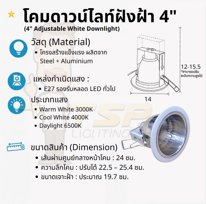 • ขนาดเจาะฝ้า: ประมาณ 19.7 ซม.