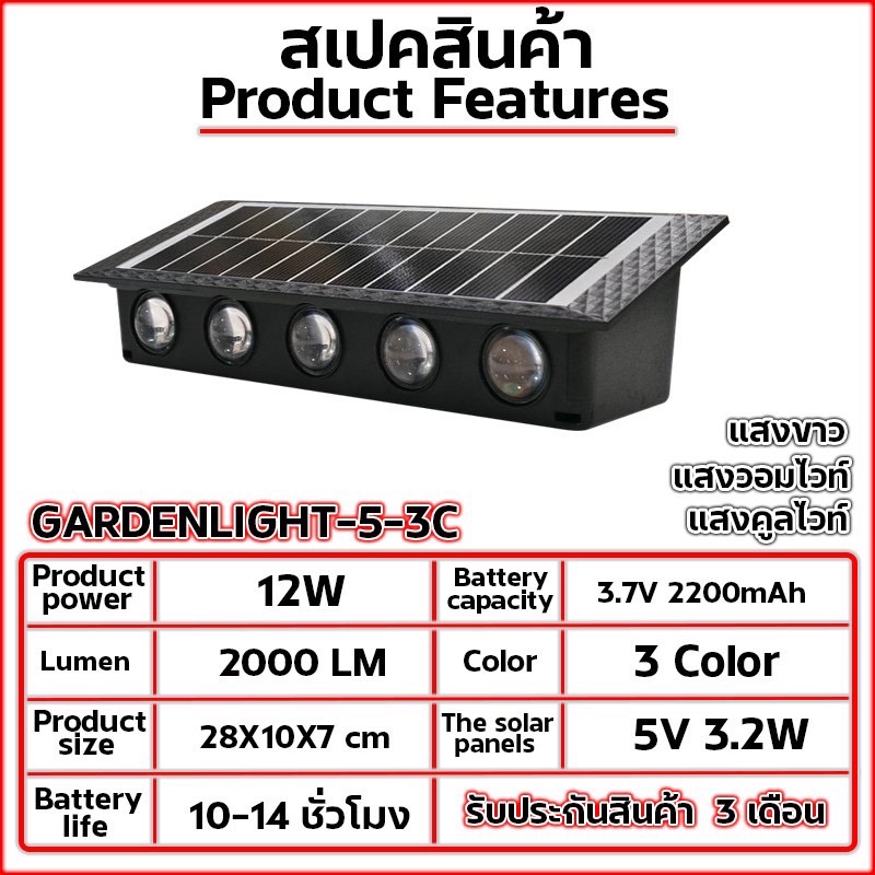 โคมไฟโซล่าเซลล์ติดผนัง5หัวเปิดได้3แสงTSP